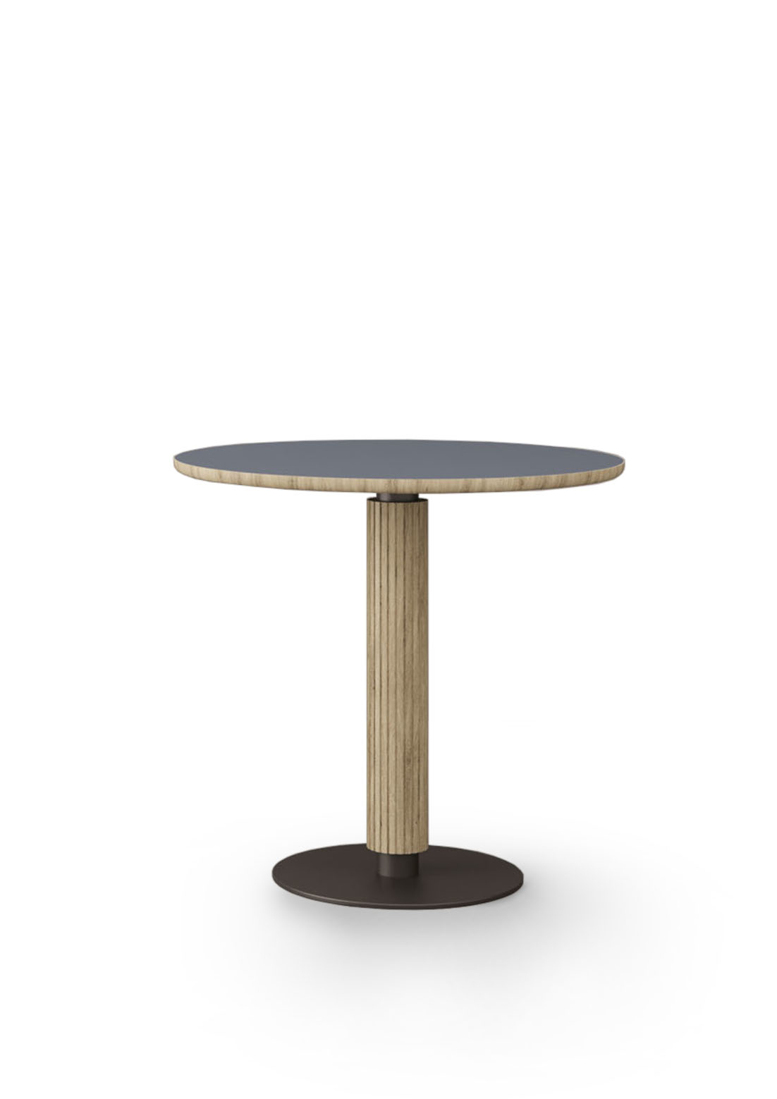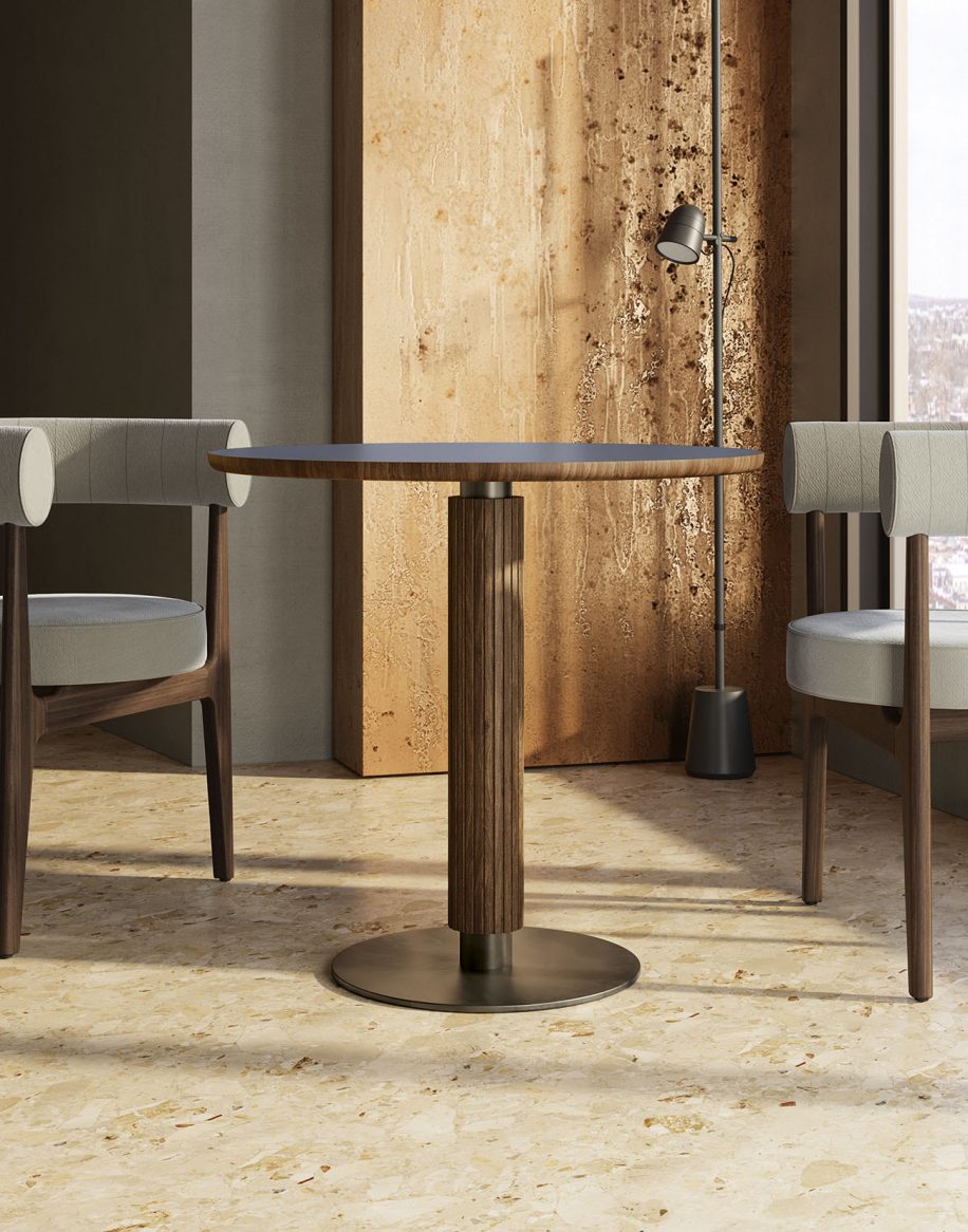 Table with a round central metal base Ø45 cm and column covered in solid ash wood.