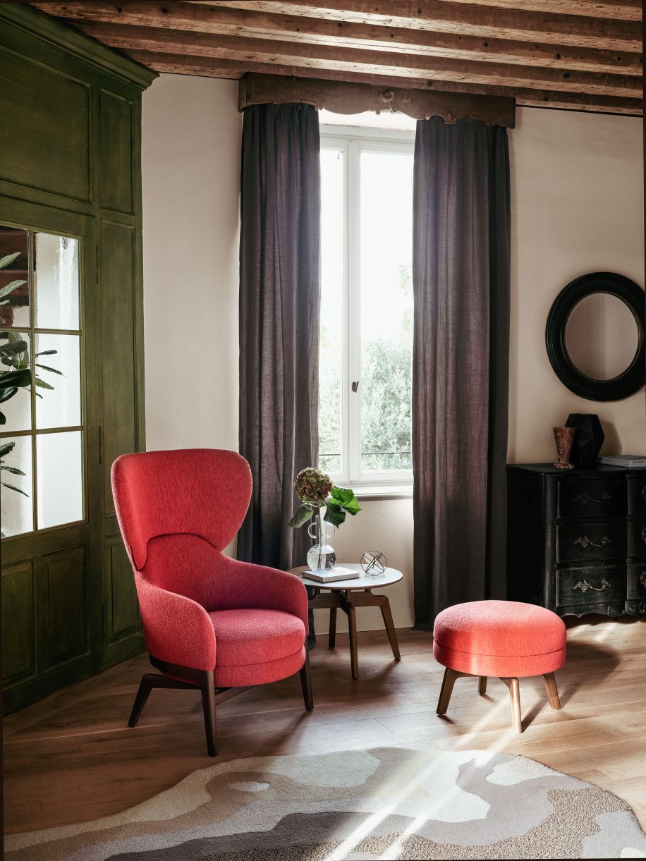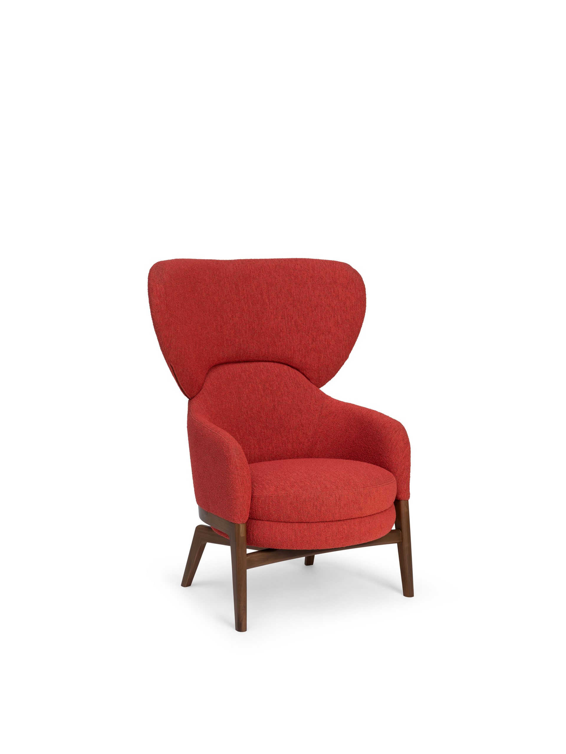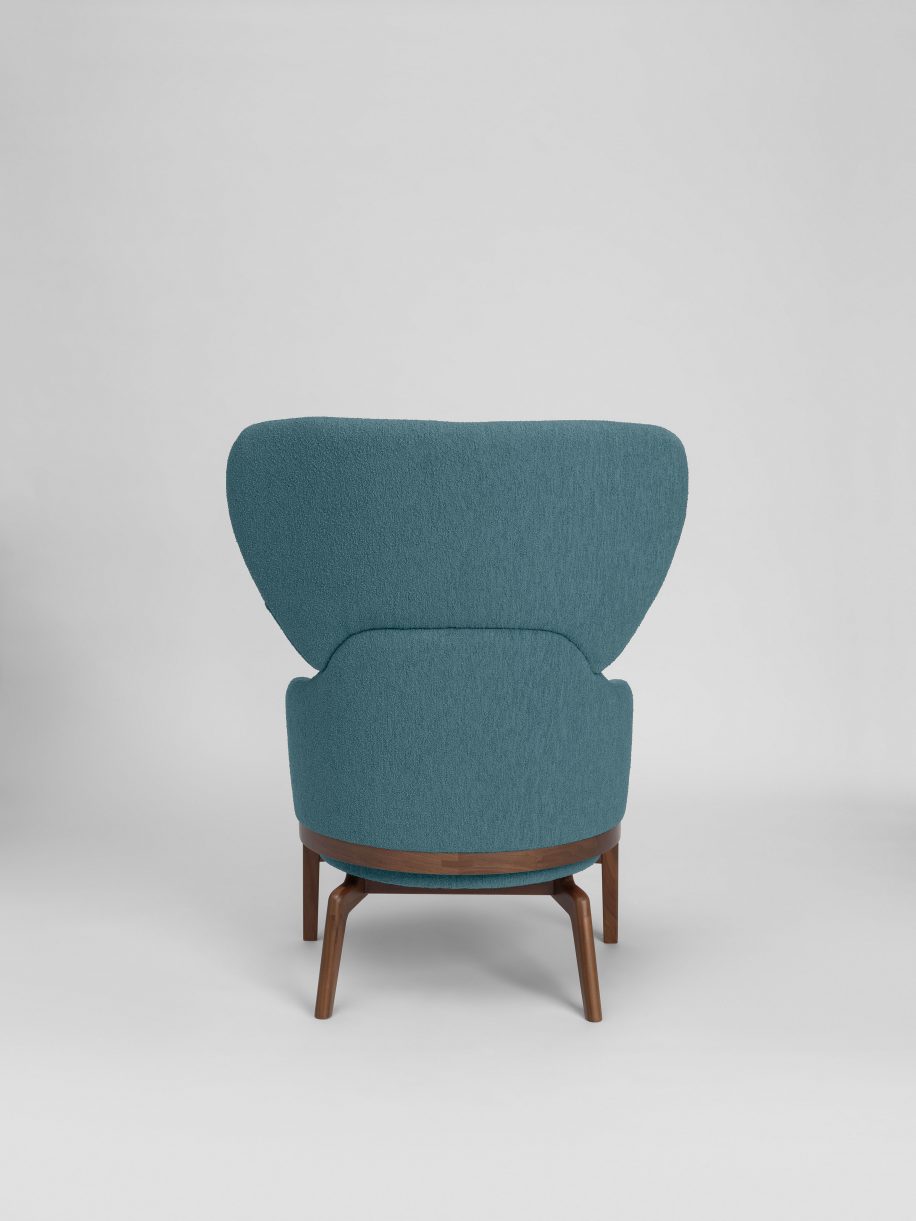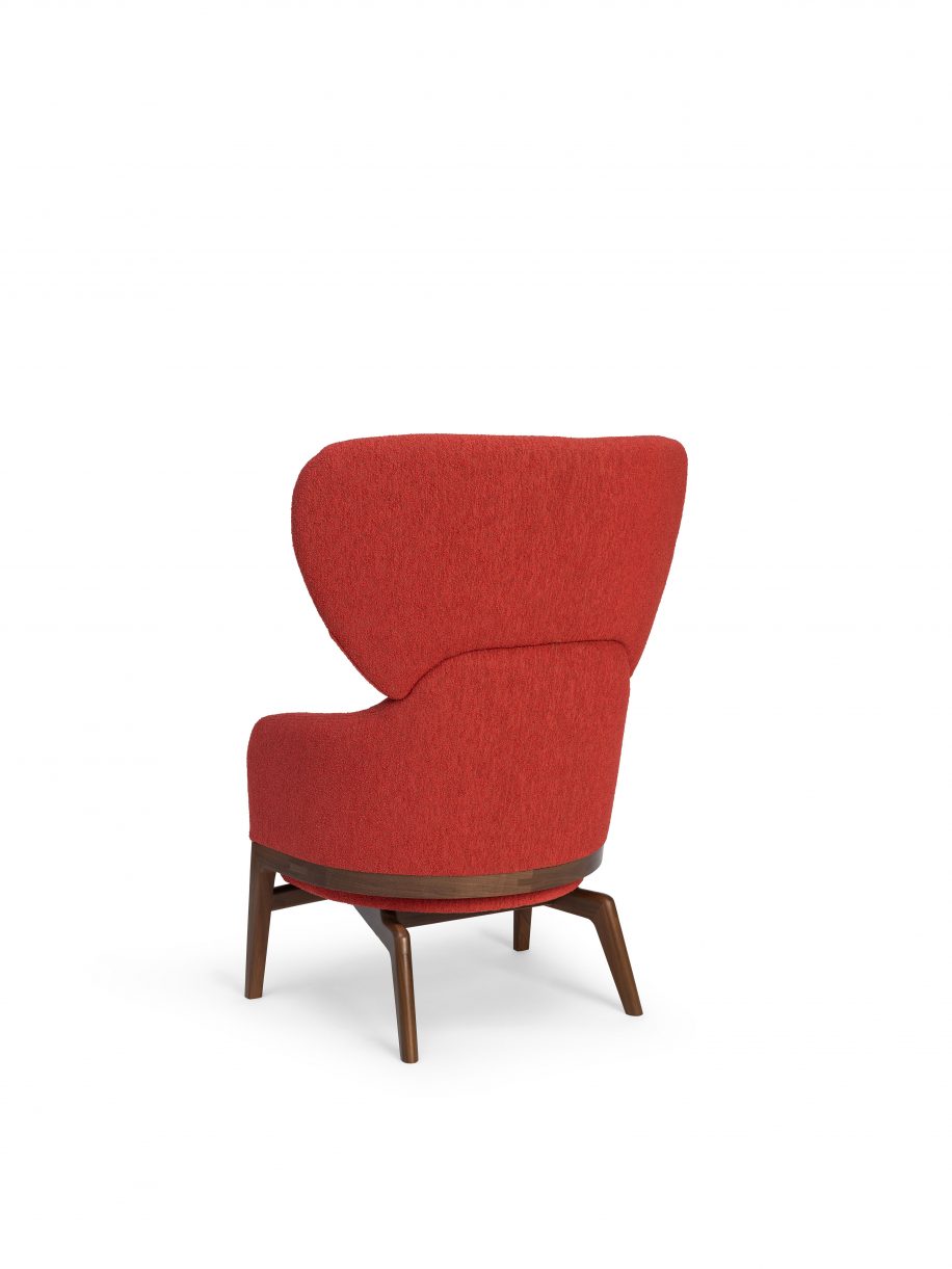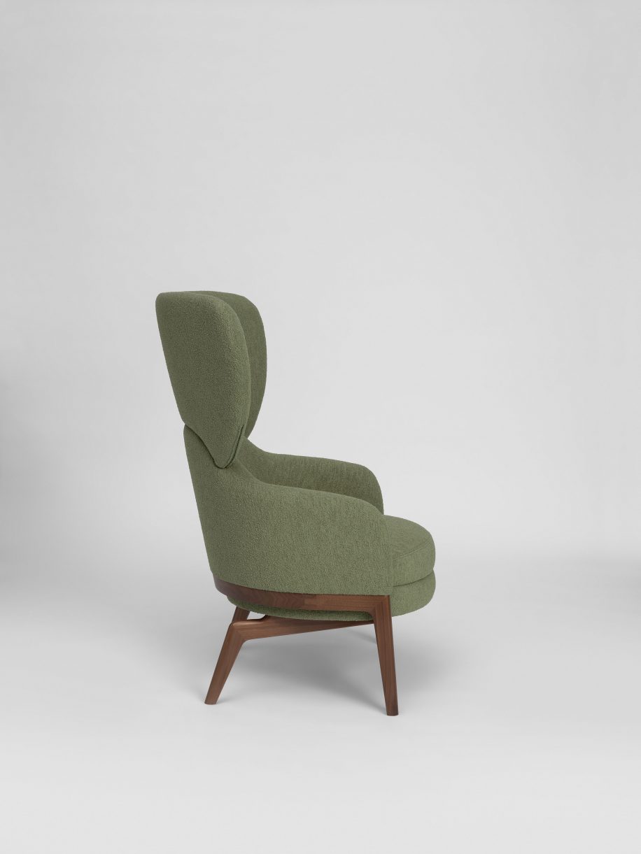 Macaron bergère displays all the features of a product developed for the contract sector: the comfort of a high enveloping backrest, characterized by a large headrest that creates an intimacy space; a soft two-layer padded seat, a perfect circle that inspires relaxation and recalls the profile of the French pastry the collection was named after; the solidity of the solid wood structure and, of course, extreme versatility in furnishing any environment. A curved wooden profile encircles the base of the body, finishing in the front legs. The profile characterizes the aesthetic of the entire seat by exhibiting a refined and contemporary trait.